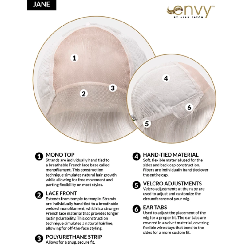 Jane features a 100% Hand-Tied construction for supremely natural movement; and a temple-to-temple Lace Front that delivers true-to-life hairline. Sharp and sporty, JANE is made with only the finest 100% Kanekalon® fiber, renowned for holding its shade, shine and shape.